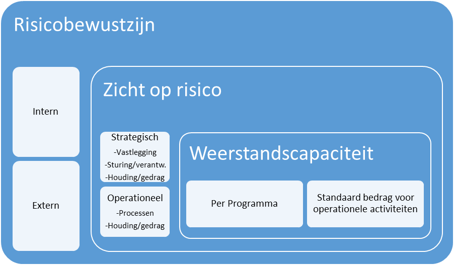Het sturen op risico’s in relatie tot doelstellingen is een ontwikkeling binnen Teylingen die zich de komende jaren verder zal uitbreiden. In het huidige begrotingsjaar ligt de nadruk op het inventariseren en beheren van de strategische risico’s per programma. Hierbij wordt gekeken naar de nettorisico’s. Dit zijn de risico’s die overblijven na het inrichten van de beheersmaatregelen. De operationele risico’s binnen het ambtelijk apparaat (HLTsamen) komen terug in de risico’s van verbonden partijen. In de komende jaren zal een grotere nadruk worden gelegd op risicobewustzijn, op zowel strategisch als operationeel niveau. De huidige opzet ten aanzien van risicomanagement is weergegeven in onderstaande figuur.